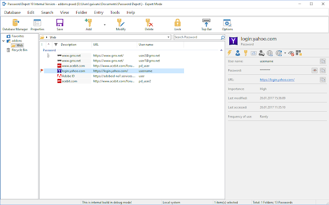 Password Depot es el administrador de contraseñas potente ayudar a organizar todas tus contraseñas, información de crédito o licencias de software. Password Depot proporciona la capacidad de almacenar tus contraseñas de forma segura, garantizando que los datos de uso seguro y le ayudará a tener contraseñas seguras.